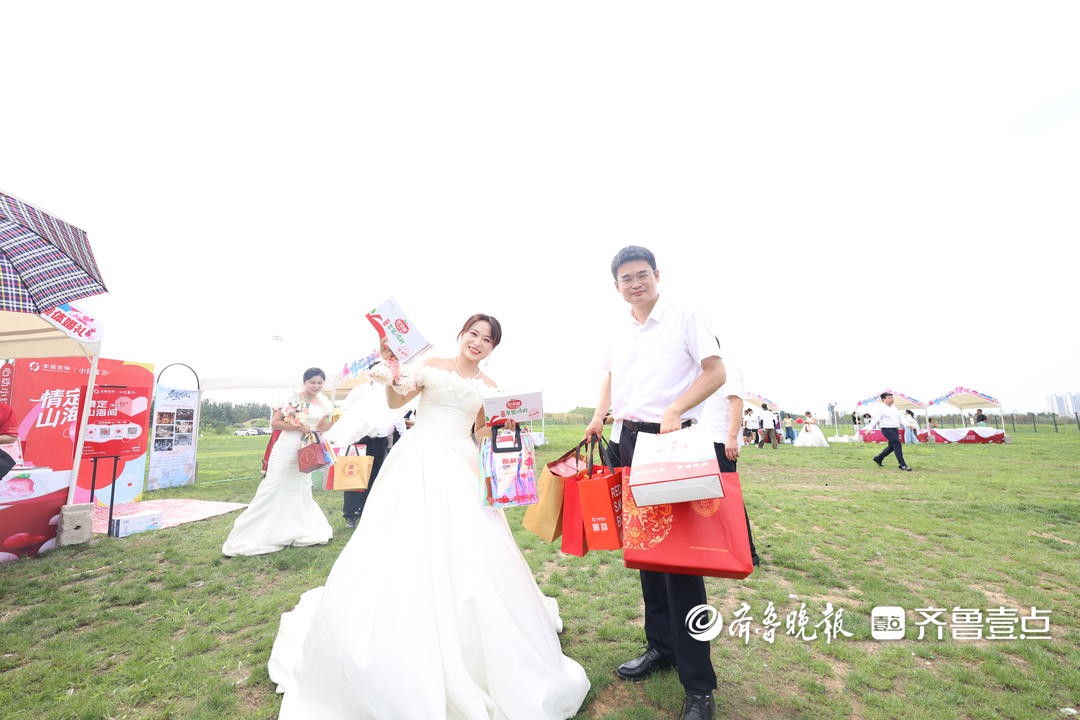新郎白明与新娘于静兴奋地展示在现场领取的“幸福礼包”