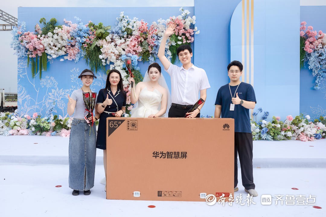 除了提供服务,28家爱心单位先后加入到“益”起添彩的行列中来,为新人们“喜上添喜”。活动为每对新人精心定制了“新婚大礼包”,14份礼品涵盖“生活、文化、纪念、服务”四大类,既饱含对新人的贴心关怀,也传递出爱心单位对新人的祝福。抽奖环节,招远华新电子有限公司和芝罘区青年路海尔专卖店更是为新人送出新婚“豪礼”:65英寸的华为智慧屏电视和一台门冰箱。